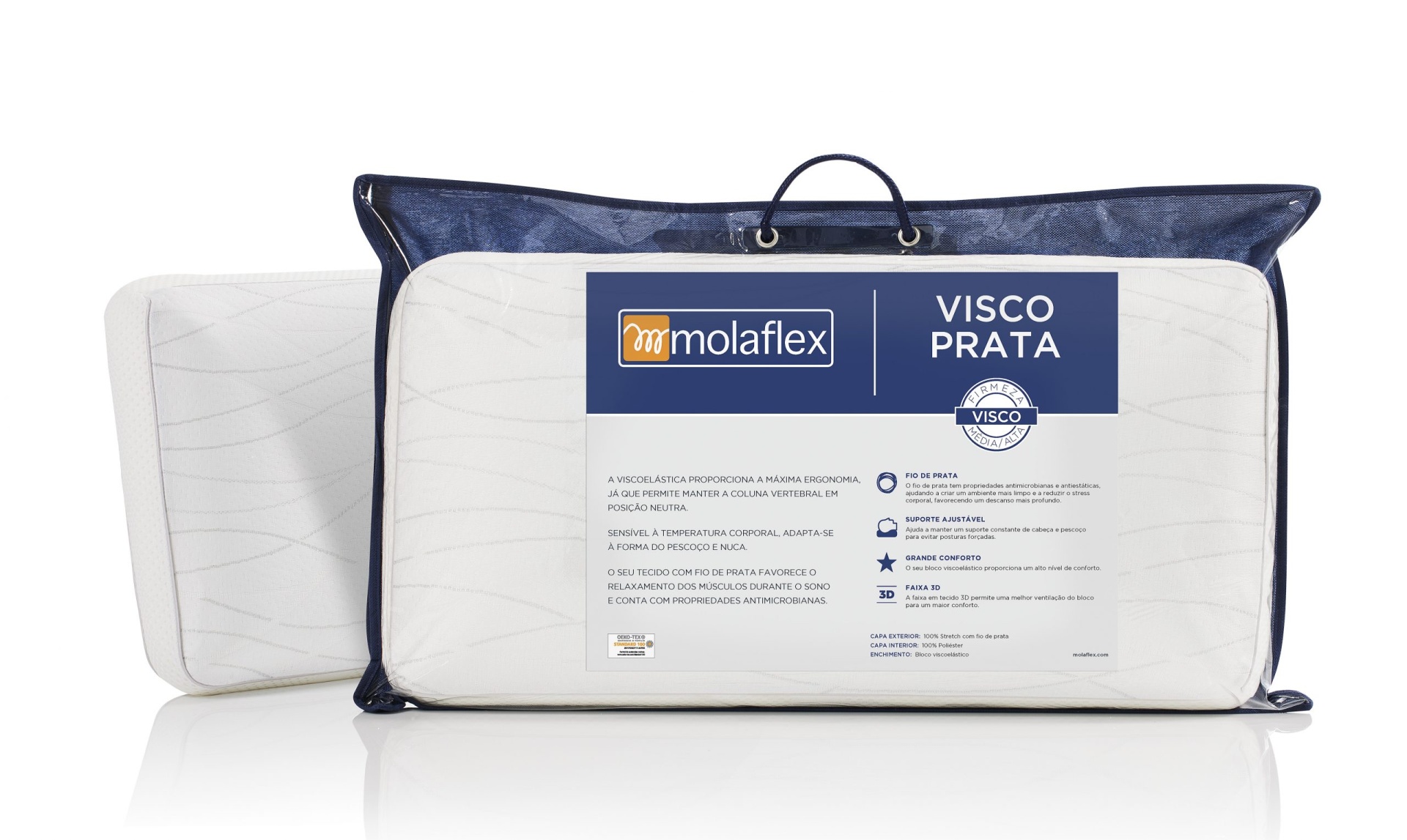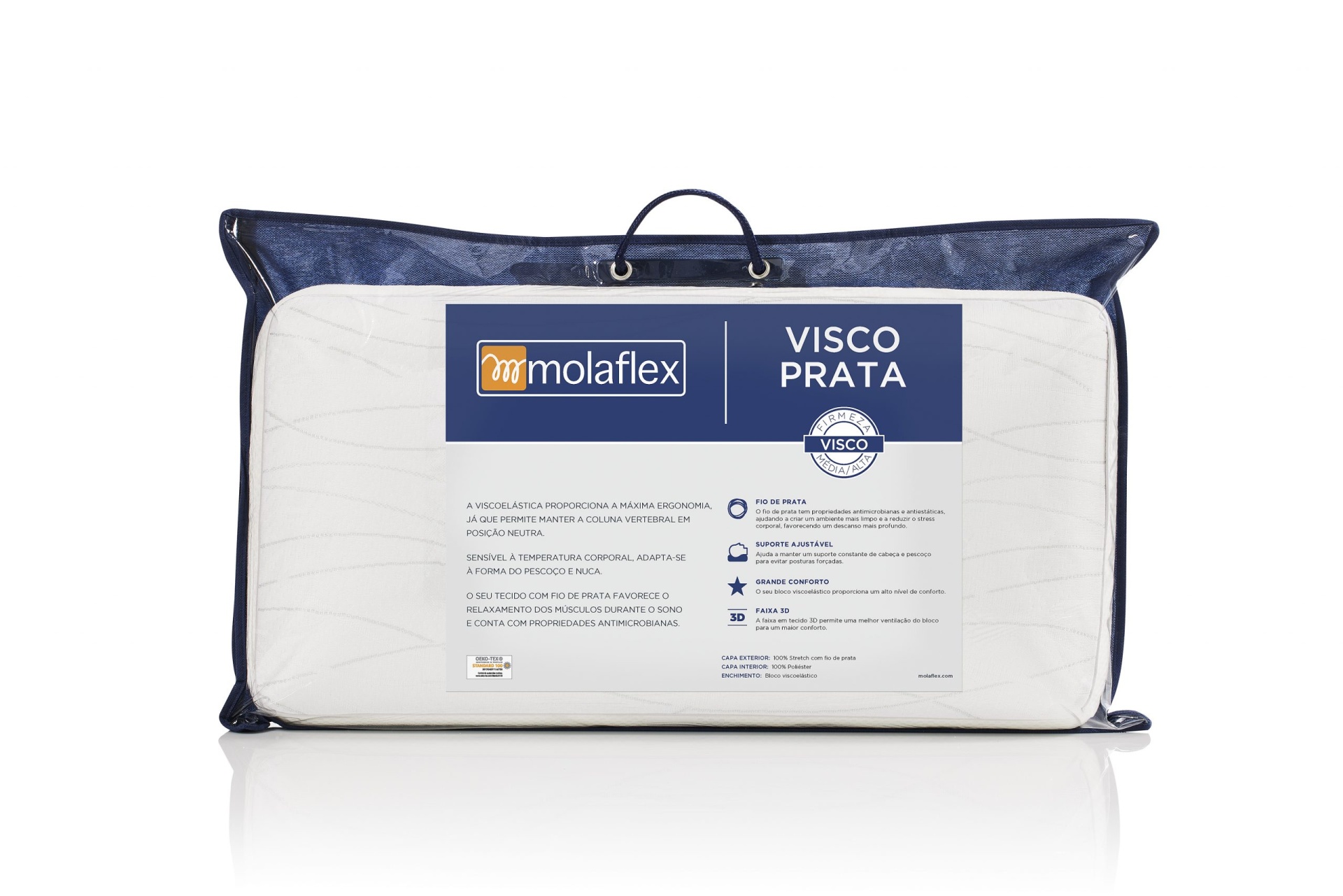Almofada Molaflex Visco Prata em embalagem transparente com bordas azul escuro, etiqueta azul e branca