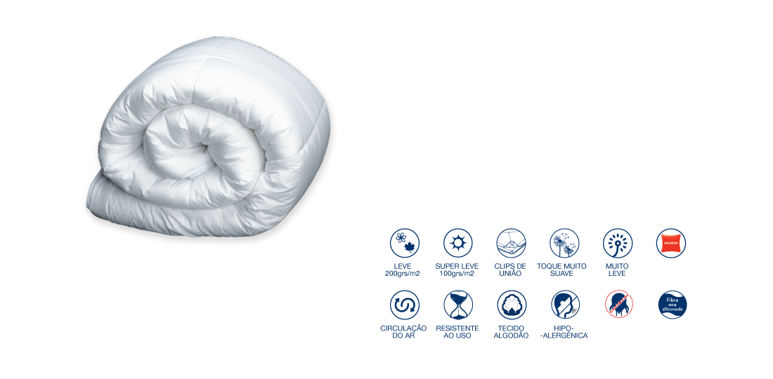 Enchimento: Fibra oca siliconada de Dacron® antiácaros, antibactérias e antifungos