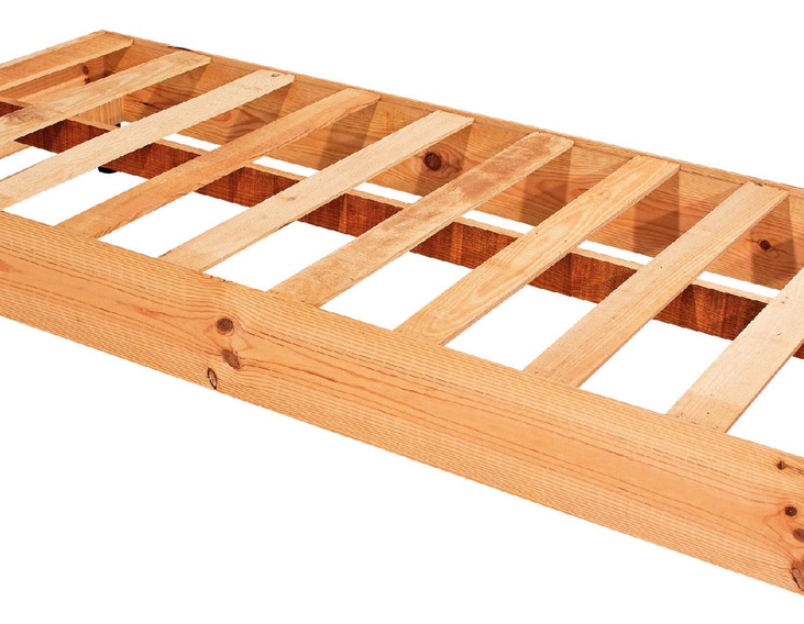 Estrado de cama em madeira clara com ripas e estrutura retangular