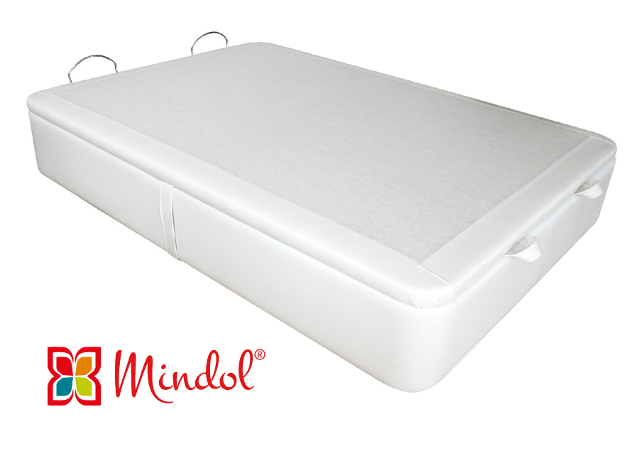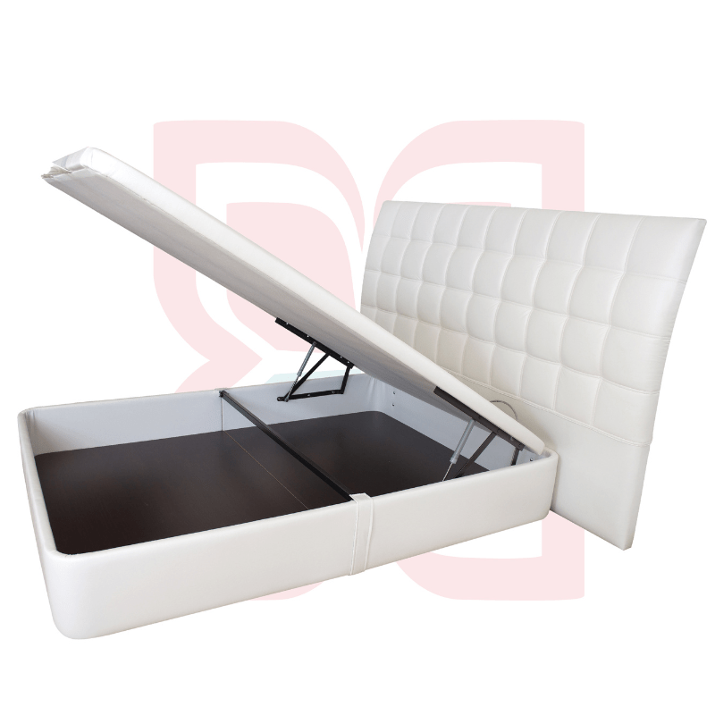 A estrutura metálica em tubo de aço com tratamento antioxidante possui travessas centrais para reforço do estrado lâminas e base. Os amortecedores que facilitam a elevação do estrado, estrado de lâminas de madeira para uma maior ventilação do colchão.