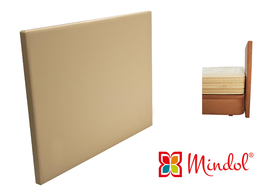 Cabeceira de cama estofada bege com cama e logótipo Mindol
