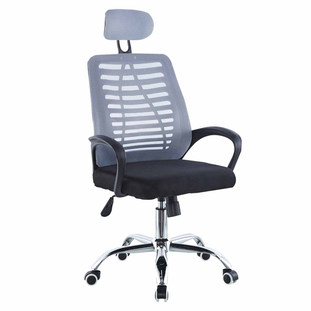 Cadeira de escritório cinzenta e preta com apoio de cabeça ajustável