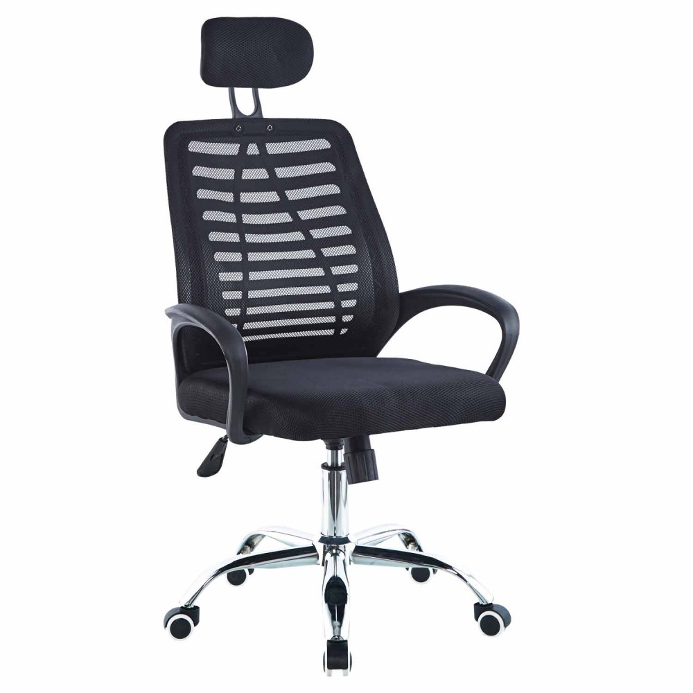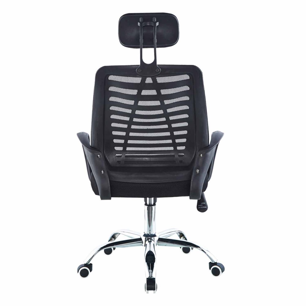 Cadeira de escritório preta com encosto em rede e apoio de cabeça