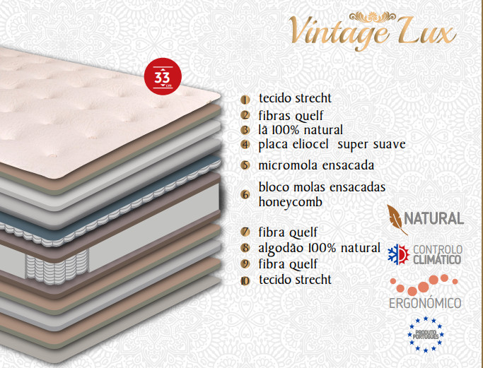 Colchão Vintage Lux com 33cm de altura, inspirado na natureza e de fabrico manual com lã e algodão 100% natural conferindo uma alta capacidade de absorver e libertar a humidade. A sua excelente moldabilidade confere uma garantia extra de conforto máximo.