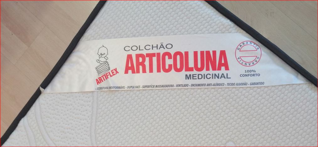 Colchão branco com etiqueta COLCHÃO ARTICOLUNA MEDICINAL e borda preta
