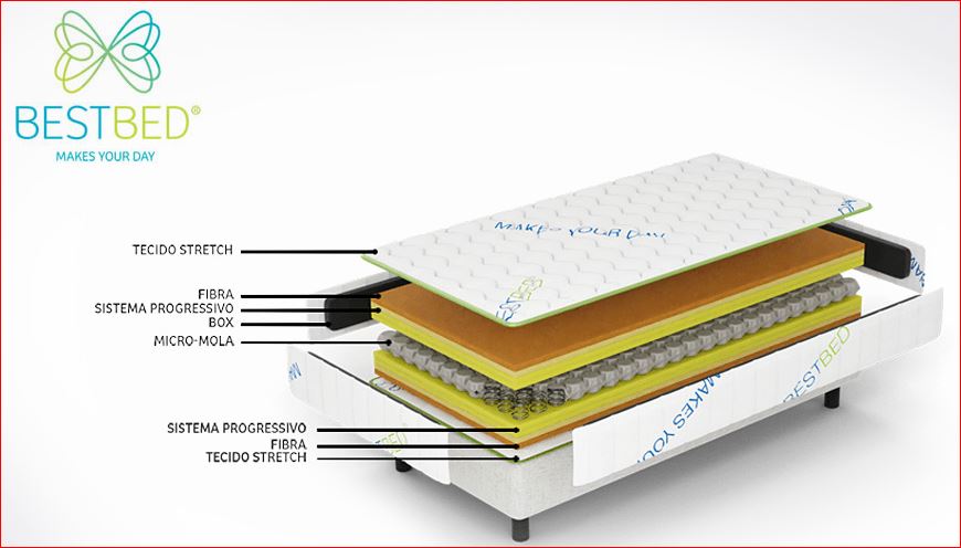Colchão Bestbed com camadas destacadas e etiquetas de materiais e sistema progressivo