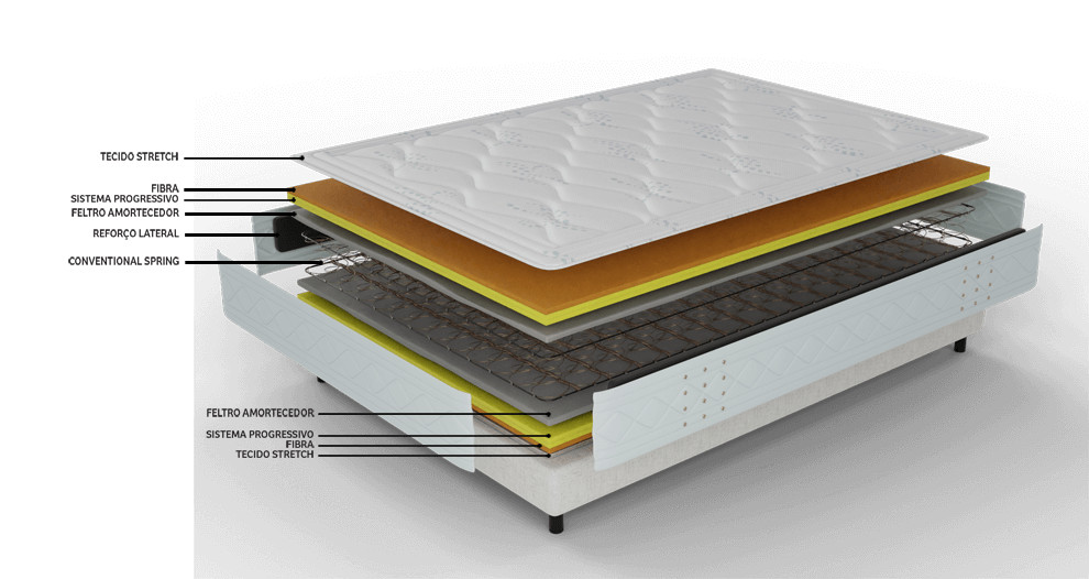 Mola Convencional - Sistema de molas bicônicas de maior densidade, que acompanham todos os movimentos do usuário de forma firme e evolutiva, principalmente apoiando a região lombar.