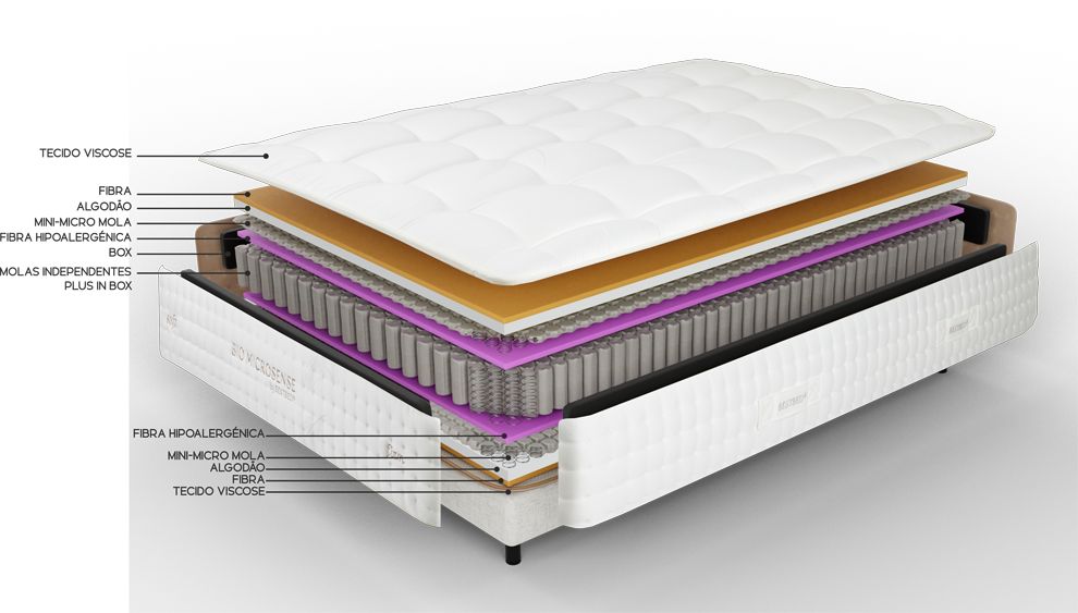 Almofada regeneradora e micro sensível, devido às características do tecido Stretch Bioceramic e das molas Mini-micro especialmente desenvolvidas para proporcionar um sono relaxante.