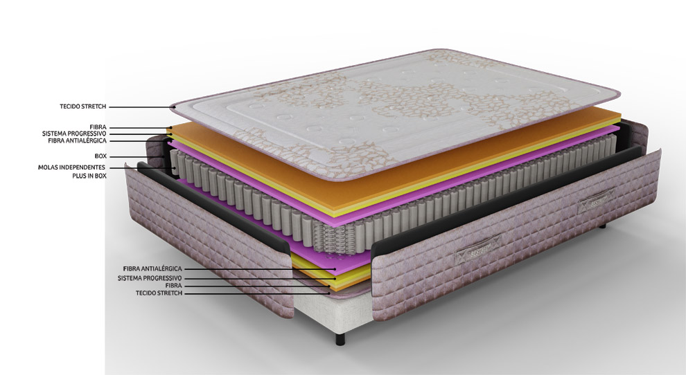 Molas Independentes Plus In Box - O sistema PLUS IN é o mais independente e silencioso. As molas são dispostas em forma de favo de mel. Adaptam-se ao seu corpo para maior conforto. Efeito ergonômico aliviando os pontos de pressão.