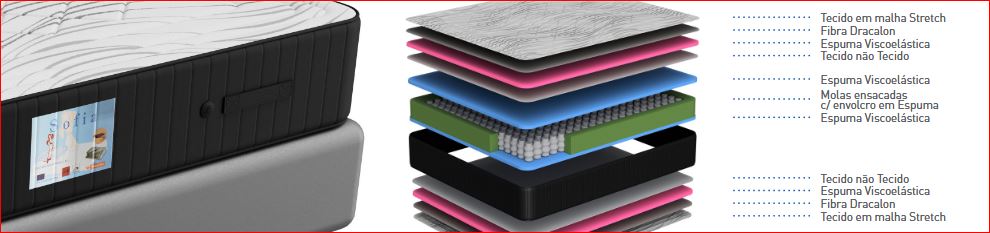 Carcaça: Molas Ensacadas individuais, com reforço periférico, para um melhor suporte ergonómico do corpo. Caixa em Espuma de 30Kg/m2.