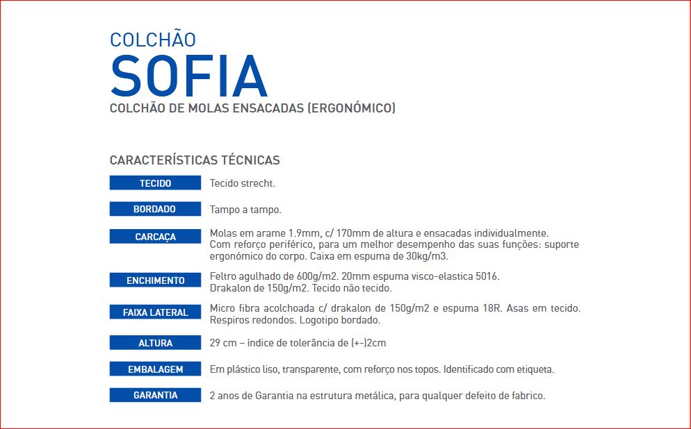 Texto técnico sobre o colchão SOFIA com especificações técnicas e características do produto