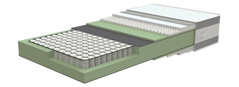 Colchão em corte transversal mostrando molas, espuma verde, camada preta e camada branca