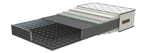 Colchão multi camadas cortado mostrando molas e tecidos