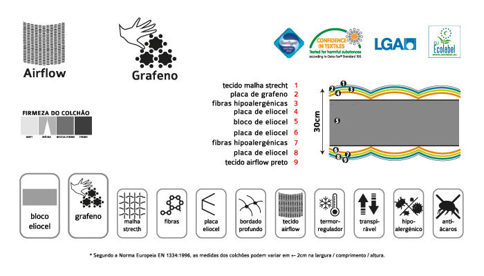 A incorporação do grafeno no colchão, converte a zona de contacto num espaço hipercondutivo capaz de processar altas doses de fluxo térmico, permitindo um descanso sem acumulação de temperatura. Alta condutividade térmica, ligeiro, flexível e elástico, alta transpirabilidade e efeito ionizante.