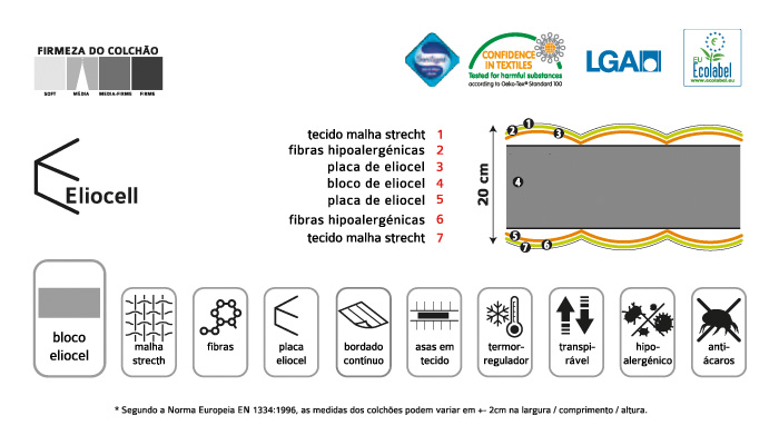 Tecido em malha Stretch nos 2 lados, com camada de fibras hipoalergénicas e centro em Eliocell.