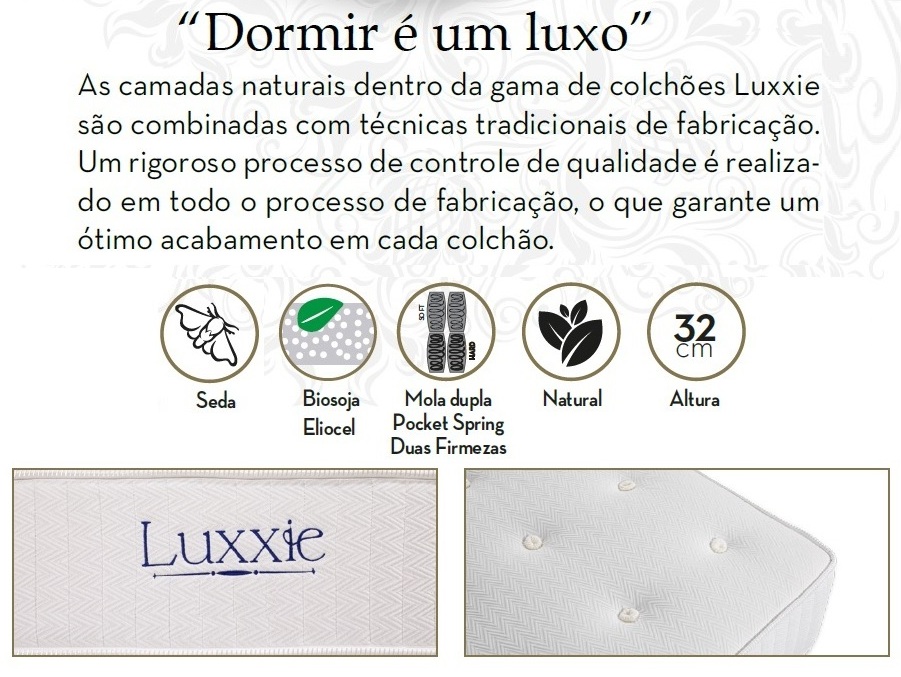 Imagem publicitária de colchão Luxxie com texto descritivo e imagens dos tecidos e etiquetas