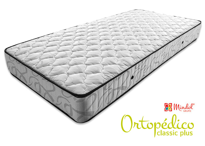 Colchão ortopédico branco com laterais cinzentas e acabamento preto, com texto Mindol GRUPO e Ortopédico classic plus