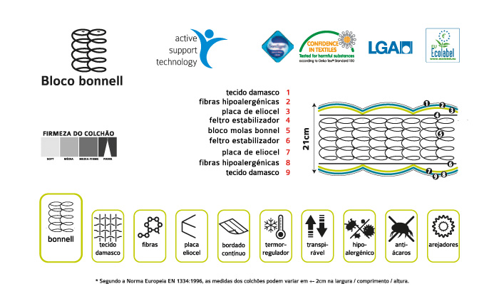 Esquema técnico e descrição detalhada das camadas e propriedades de um colchão com bloco Bonnell, incluindo texturas, materiais e certificações.