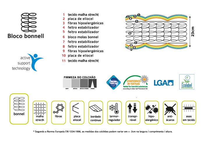 Diagrama técnico e etiquetas informativas de colchão Bloco Bonnell com camadas e certificações