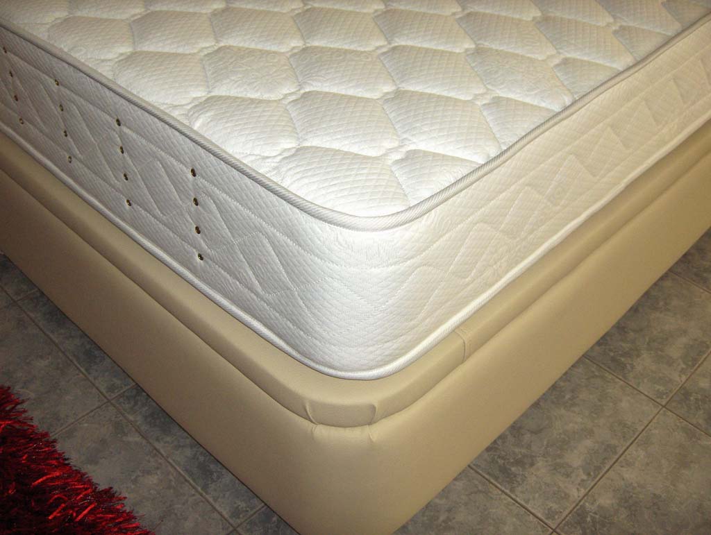 Colchão branco acolchoado sobre base estofada bege em chão de azulejos