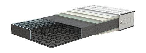 Colchão com camadas internas visíveis, molas e espuma, fundo branco