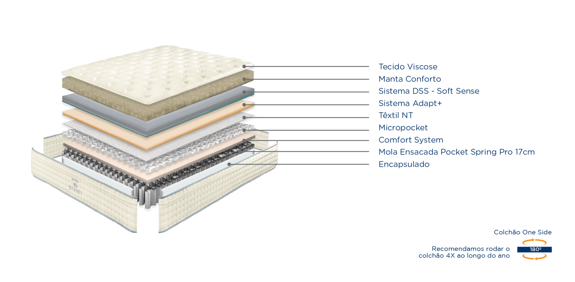 Colchão em corte transversal com várias camadas de materiais e inscrição de suas características técnicas.