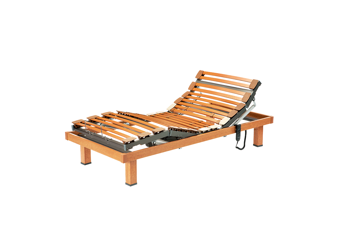Estrado com 5 planos de inclinação, incluindo a cervical e fixações especiais na zona dos ombros. As lâminas da madeira de eucalipto estão juntas em grupos de dois com 12 tensores na zona lombar para regulação da firmeza. Cada lâmina está fixada à estrutura com suportes flexíveis de borracha que permitem uma completa adaptabilidade ao corpo.