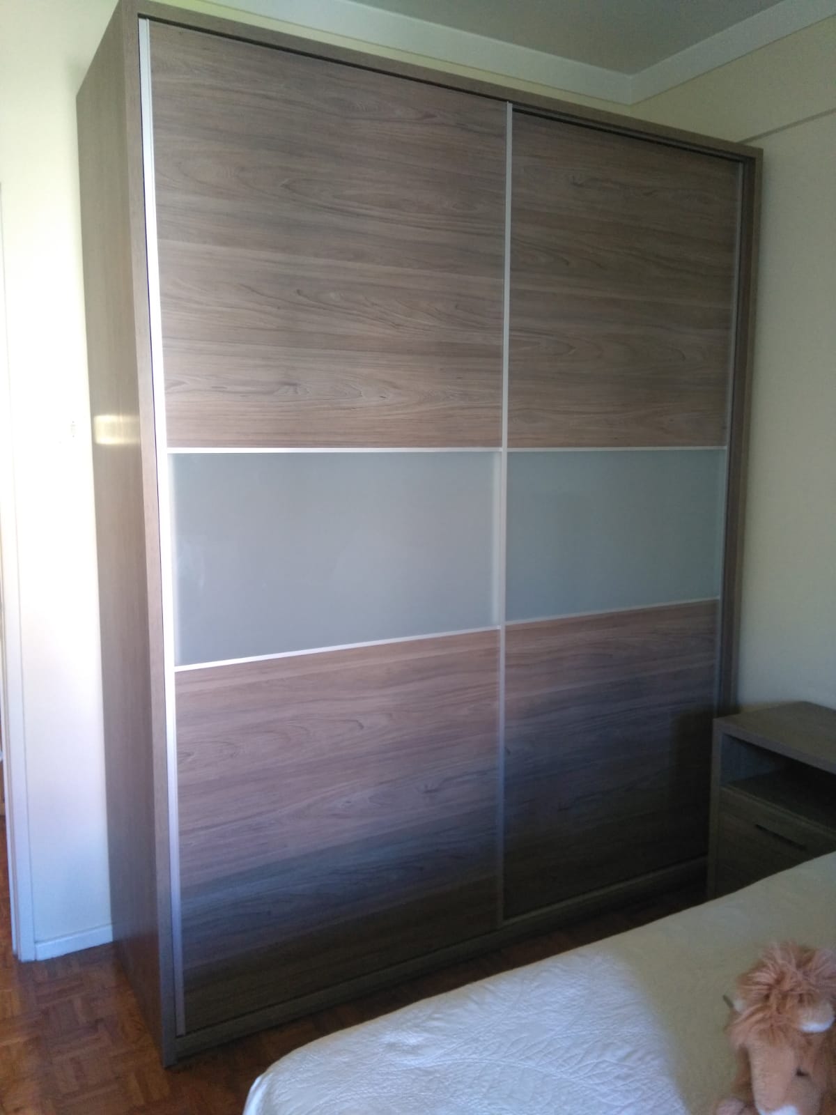 Armário de portas de correr em madeira castanha com faixas cinzentas no meio e moldura metálica