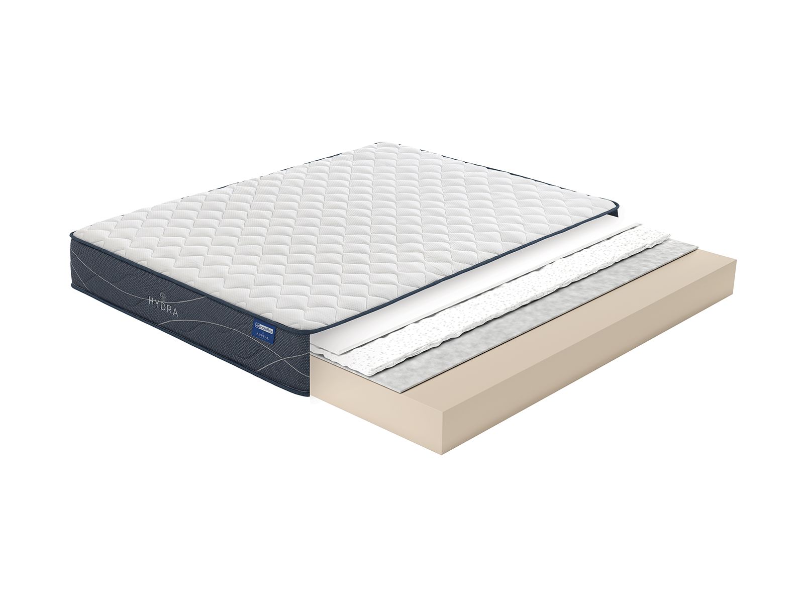 Colchão branco com layers interiores visíveis e base bege