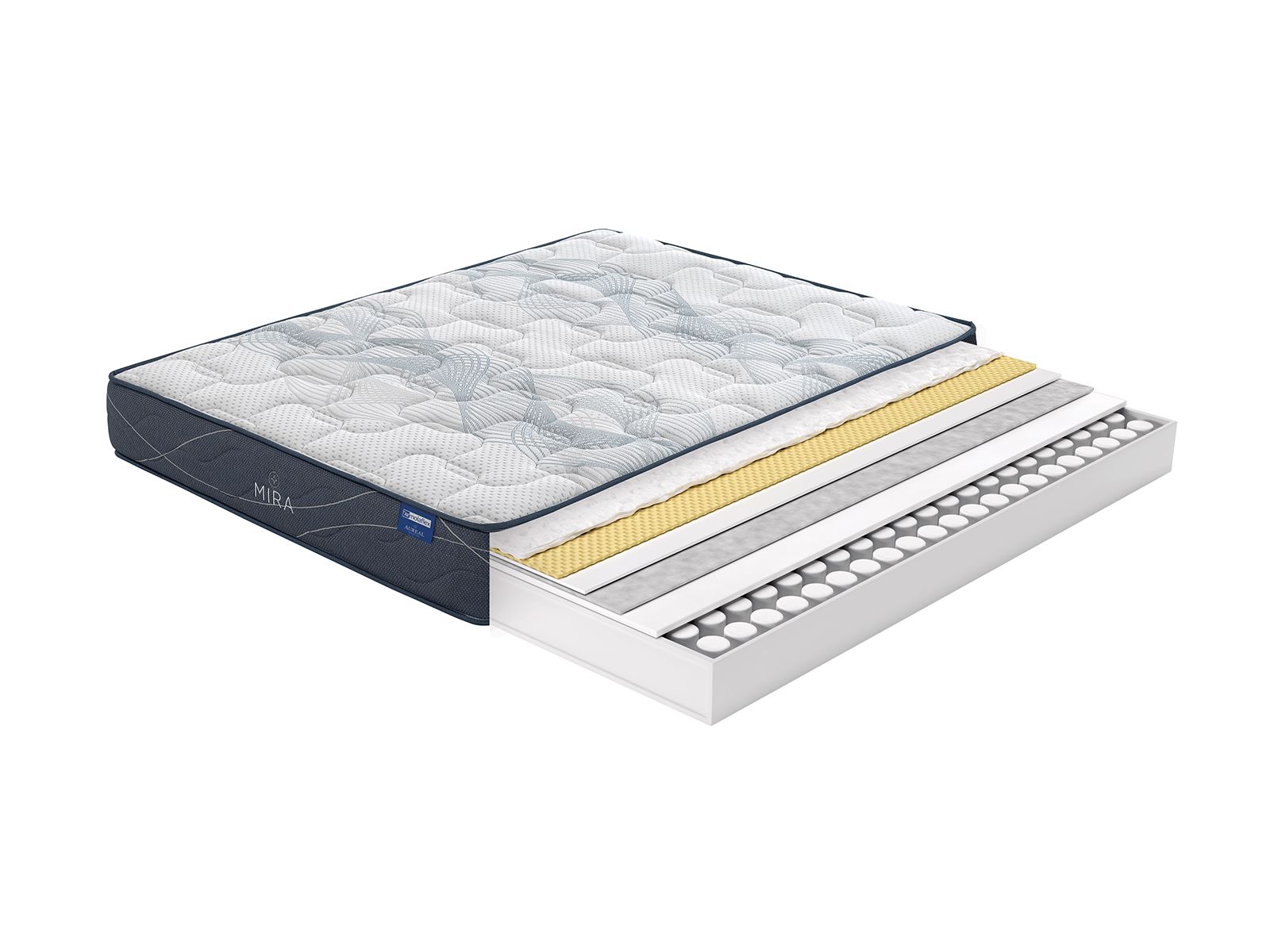 Colchão retangular branco com padrão cinza e laterais azul escuro