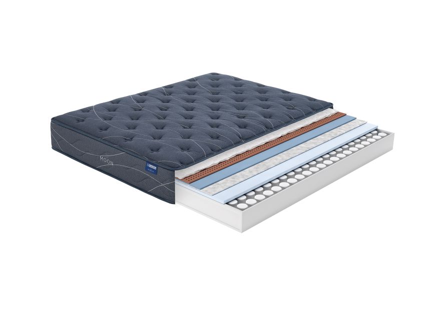 Colchão azul escuro cortado ao meio mostrando camadas internas diferentes