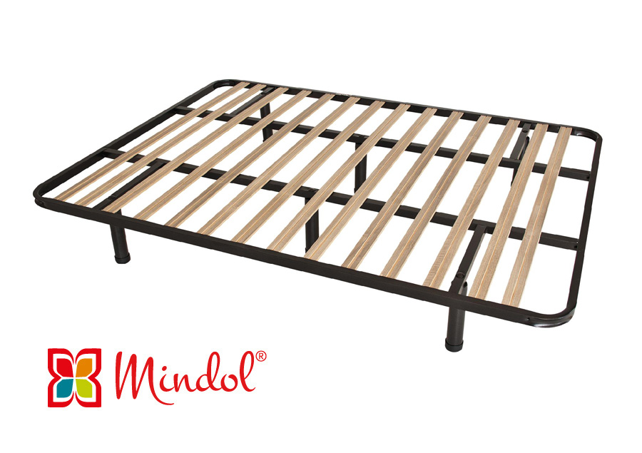 Base de cama castanha com quatro pés pretos e logo Mindol